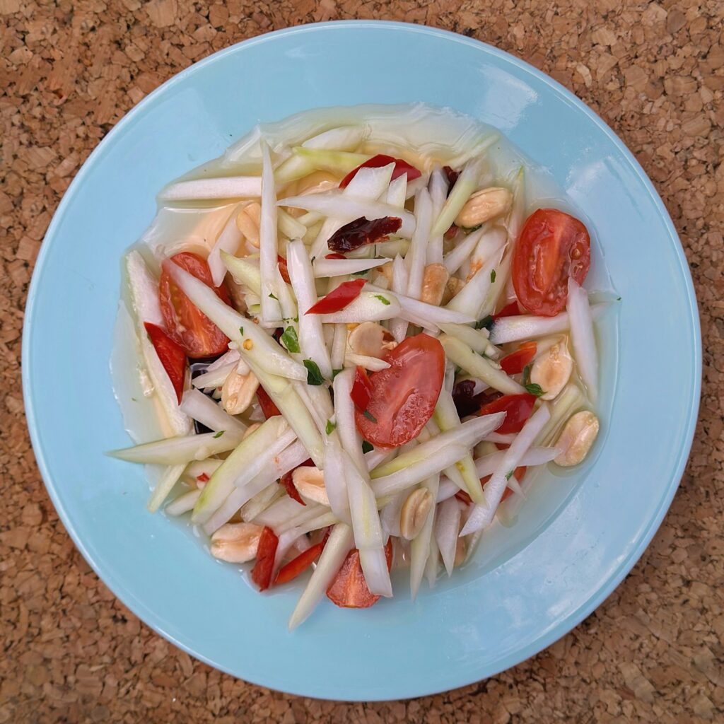 Le Som Tam est une salade emblématique de la cuisine thaïlandaise! Elle est composée de papaye verte croquante, de tomates, de haricots longs thaï, du sucre de palme, et d’ail. Le tout est relevé par des piments et assaisonné de sauce poisson et de citron vert.