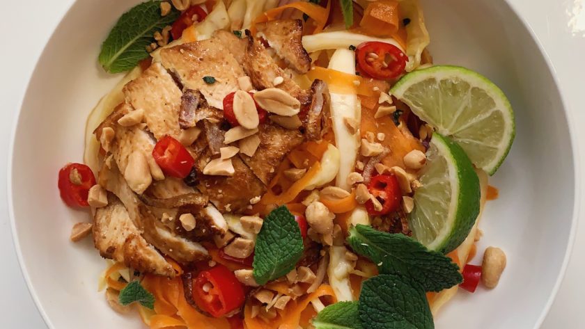 - Servir la salade, avec le poulet, ajouter des échalotes frites, des cacahuètes et du citron vert.