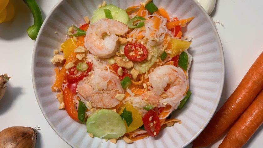 - Dans un plat, ajouter les vermicelles, la carotte râpée, le piment, le poivron, le concombre, l’oignon vert, et les crevettes. Verser les ingrédients pour la vinaigrette, bien mélanger.